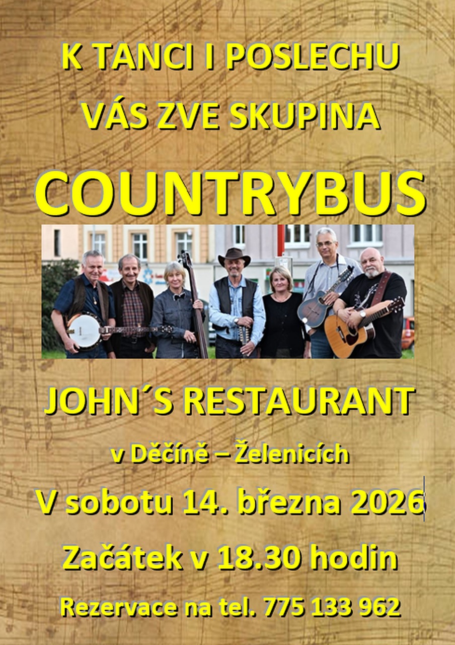 Naše oblíbená restaurace John´s Restaurant v Děčíně - Želenicích se v sobotu 14. března 2026 rozezní tóny country hudby. Pokud si chcete udělat příjemný večer, začínáme v 18.30 hodin.